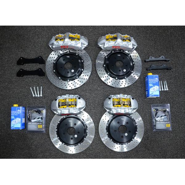 Go fast and stop faster. TEI Racing Big Brake Kits provide you with serious braking power when you need it most. TEI Racing brake kits are offered for both the front and rear brakes with rotor sizes ranging from 285mm-405mm drilled or slotted or drilled and slotted, 2-6 piston Forged Monoblock aluminum caliper options, and custom colors. Stainless steel brake lines, brake pads, and all hardware are included for a direct bolt-on installation where no modifications are required.